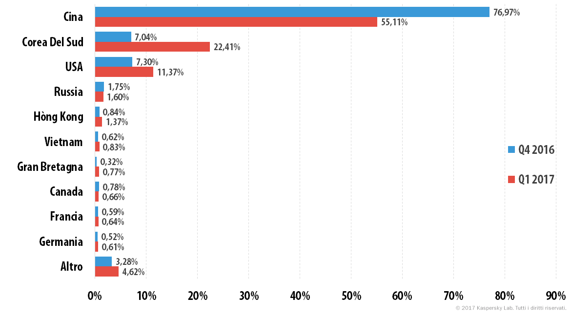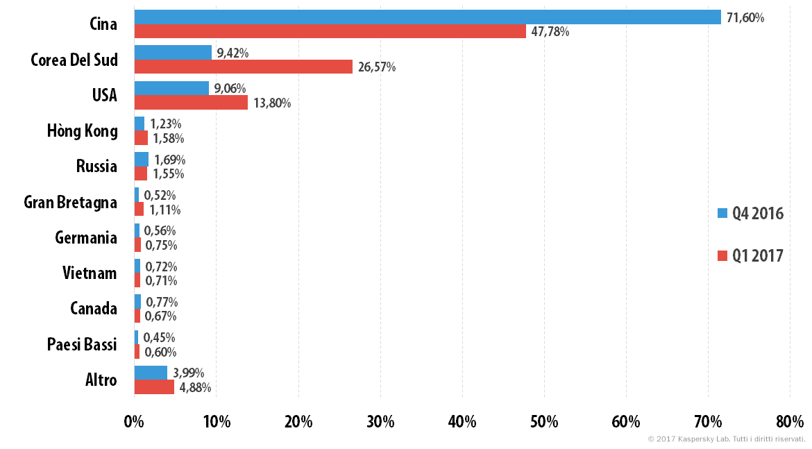 La leadership della speciale graduatoria geografica relativa al numero di server di comando e controllo (C&C) individuati sul territorio dei vari paesi, continua ad essere detenuta, con ampio margine, dalla Corea del Sud. Rispetto al precedente trimestre da noi analizzato, la quota riconducibile al paese asiatico ha fatto peraltro registrare un significativo aumento, passando dal 59% al 66,49%. La seconda posizione della TOP 10 relativa al primo trimestre del 2017 risulta occupata dagli Stati Uniti, con una quota pari al 13,78%; sul terzo gradino del “podio” virtuale si sono poi collocati i Paesi Bassi (3,51%); non fa invece più parte della “trojka” dei leader la Cina (1,35%), il cui indice percentuale è diminuito di varie volte rispetto al trimestre precedente. La quota complessivamente attribuibile ai tre paesi che si sono situati nelle posizioni di vertice del rating qui sotto inserito è risultata pari all’83,8% del numero complessivo di server di comando e controllo individuati nell’arco del 1° trimestre dell’anno in corso.